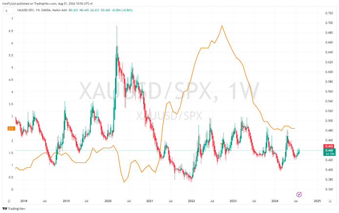Fig 3- Chart shows Gold vs. SPX, plotted against US Core CPI (y/y), displaying limited directional linkage